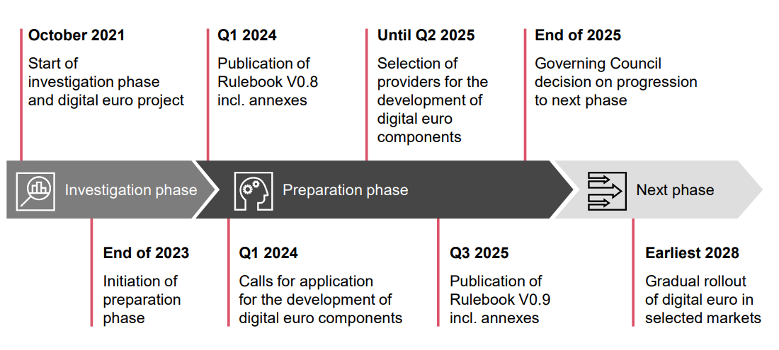 Envisioned timeline for digital euro rollout. Source: PwC