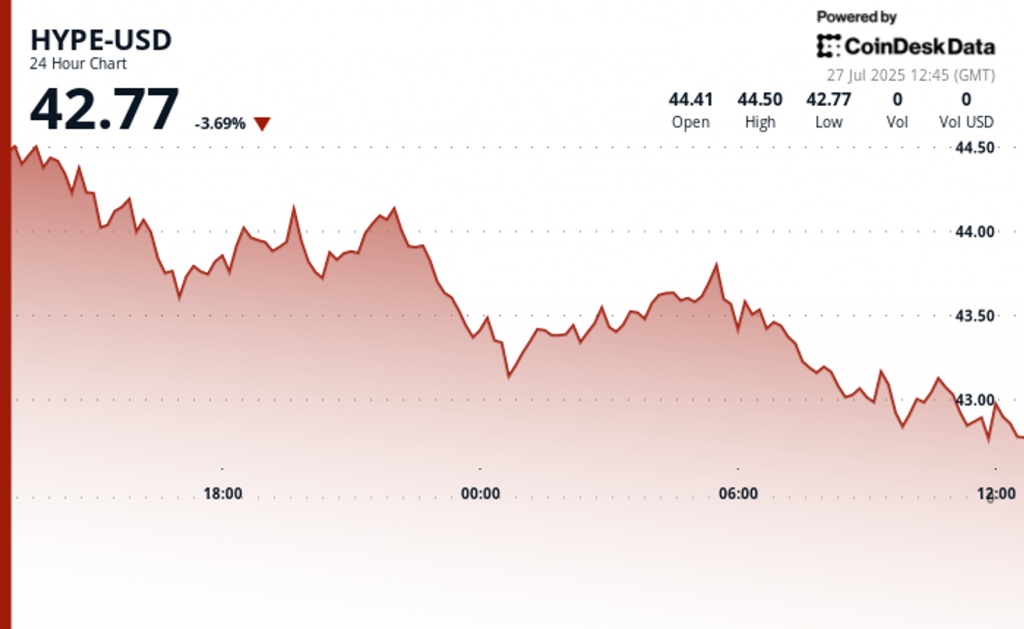 At the time of writing, according to CoinDesk Data, HYPE is trading at $42.77, down 3.69% in the past 24-hour period.