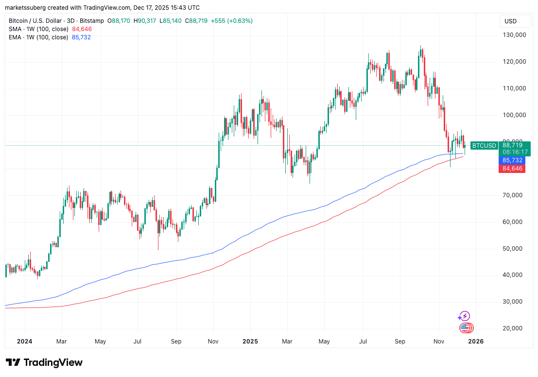 BTC/USD three-day chart with 100-week SMA, EMA. Source: Cointelegraph/TradingView