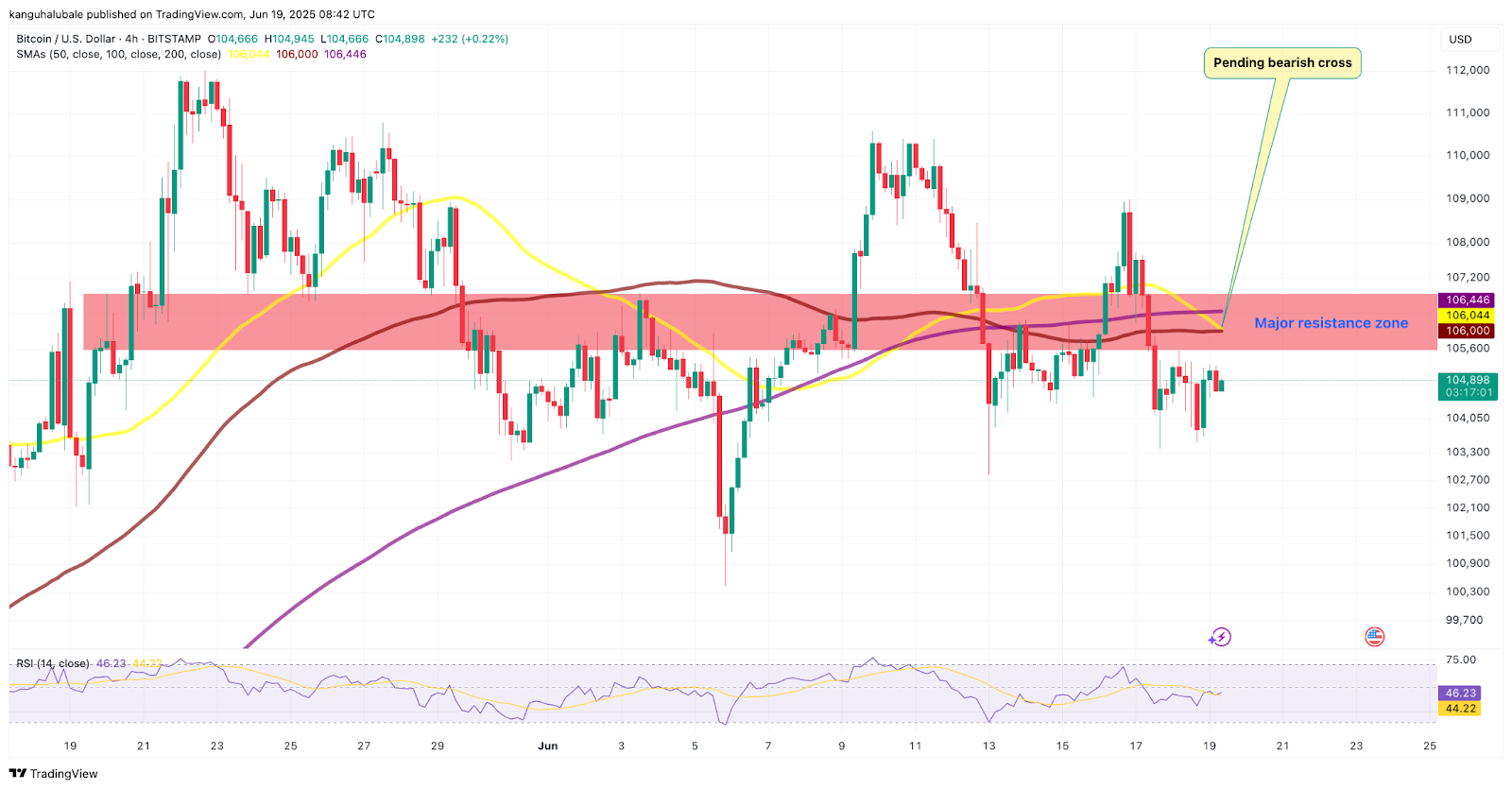 Bitcoin’s price is trapped below the 100-period simple moving average (SMA) at $106,000, the 50 SMA at $106,040 and the 200 SMA at $106,400, which act as significant resistance as shown in the chart below.