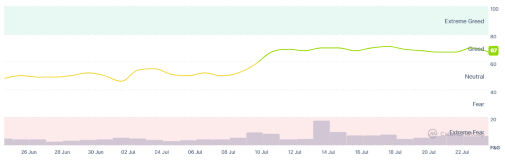 Furthermore, the crypto market sentiment has dropped today, but it still remains in greed territory. It stands at 67 today, compared to 70 yesterday.