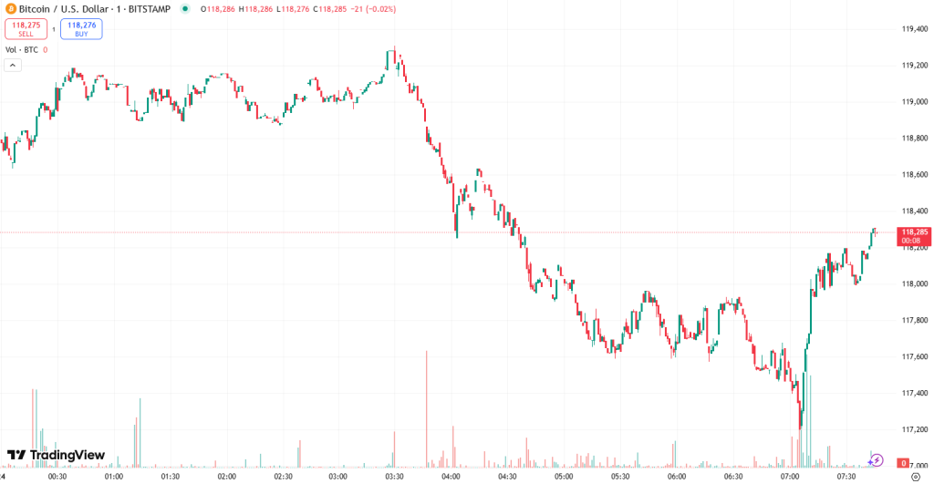 At the time of writing, BTC trades at $118,256. Its intraday high was $119,197, after which the price fell to the intraday low of $117,422, before returning to the current level.