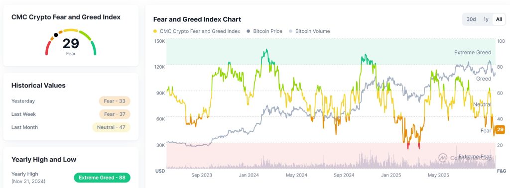 Meanwhile, the crypto market sentiment remains deep in the fear zone, with the Crypto Fear and Greed Index dropping to 29, signaling rising caution among traders. The index has fallen from 33 yesterday and 37 last week, marking a steady decline in investor confidence over recent days.