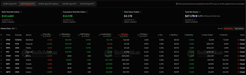The US spot Ethereum ETFs also saw a total daily net inflow of $141.66 million on October 21, according to SoSoValue data.