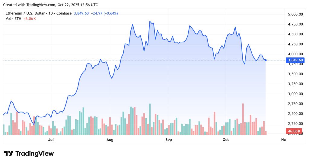 Meanwhile, Ethereum is trading around $3,849, down 0.64% in the last 24 hours. ETH has been consolidating within a wide range between $3,750 and $4,250 since early October, with declining volume suggesting reduced market participation.