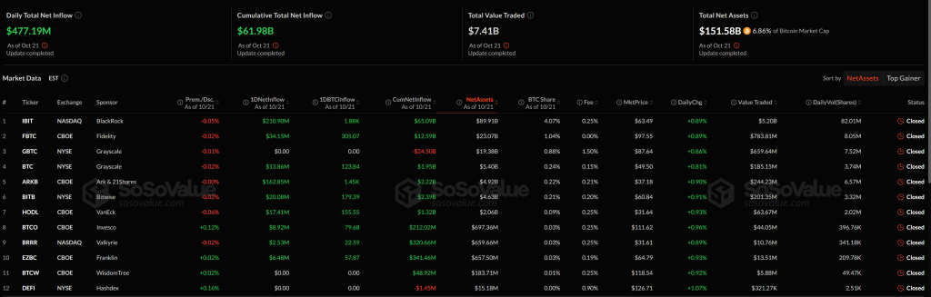 The US spot Bitcoin ETFs saw a strong rebound in inflows on October 21, recording a total daily net inflow of $477.19 million, according to SoSoValue data.