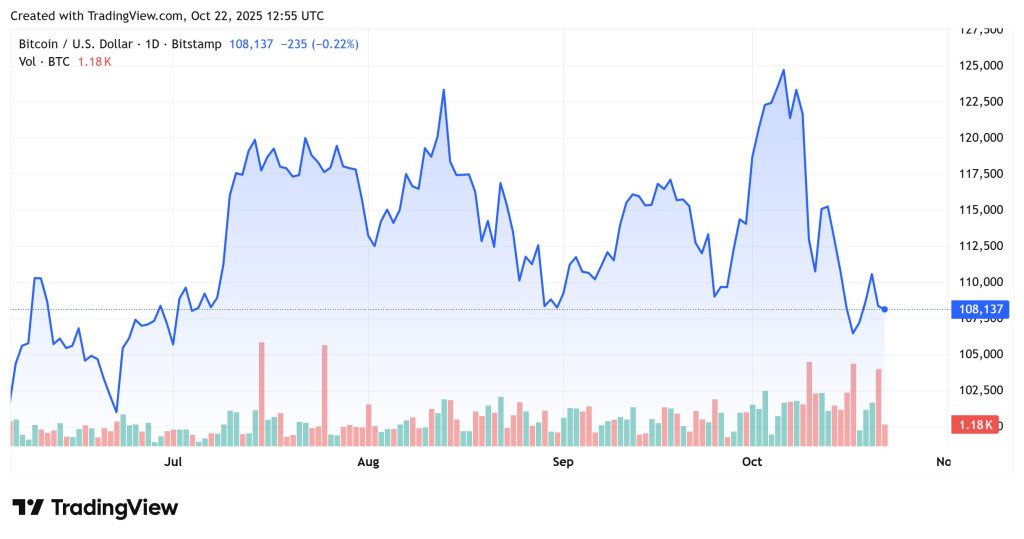 At the time of writing on Wednesday, Bitcoin trades at $108,137, showing a slight intraday decline of 0.22%. The price briefly dropped to an intraday low near $107,500 after failing to hold above $109,000 earlier in the session. BTC has been moving sideways over the past few days as traders await fresh macro catalysts.