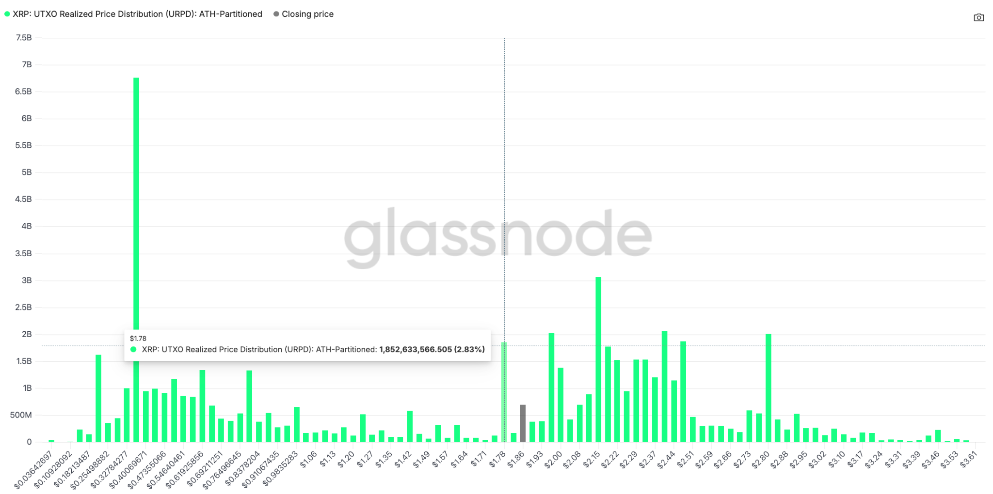 Glassnode’s UTXO realized price distribution (URPD) — a metric that shows the average prices at which SOL holders bought their coins — reveals that the next significant support sits at $1.78, where approximately 1.85 billion XRP were previously acquired.