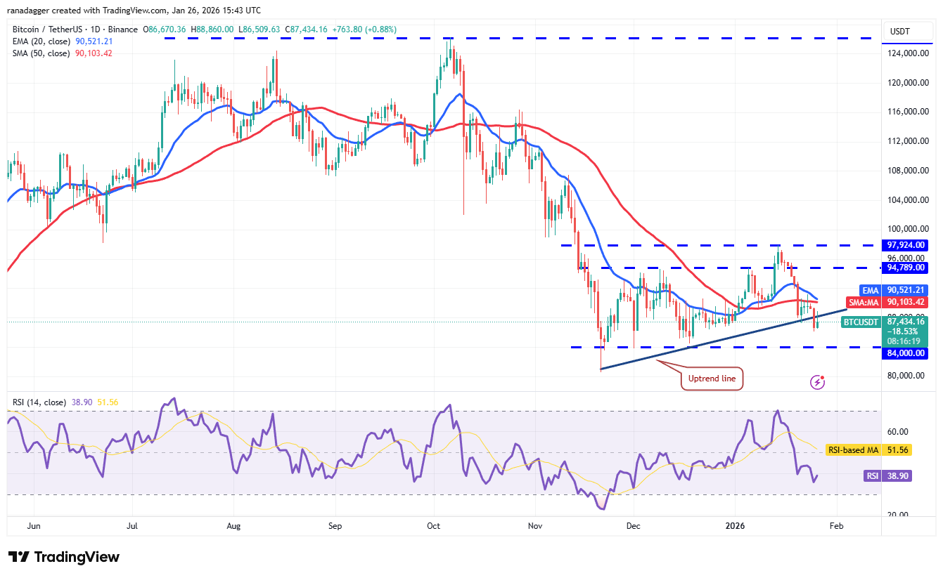 BTC turned down from the 20-day EMA ($90,521) on Friday and plunged below the uptrend line on Sunday.