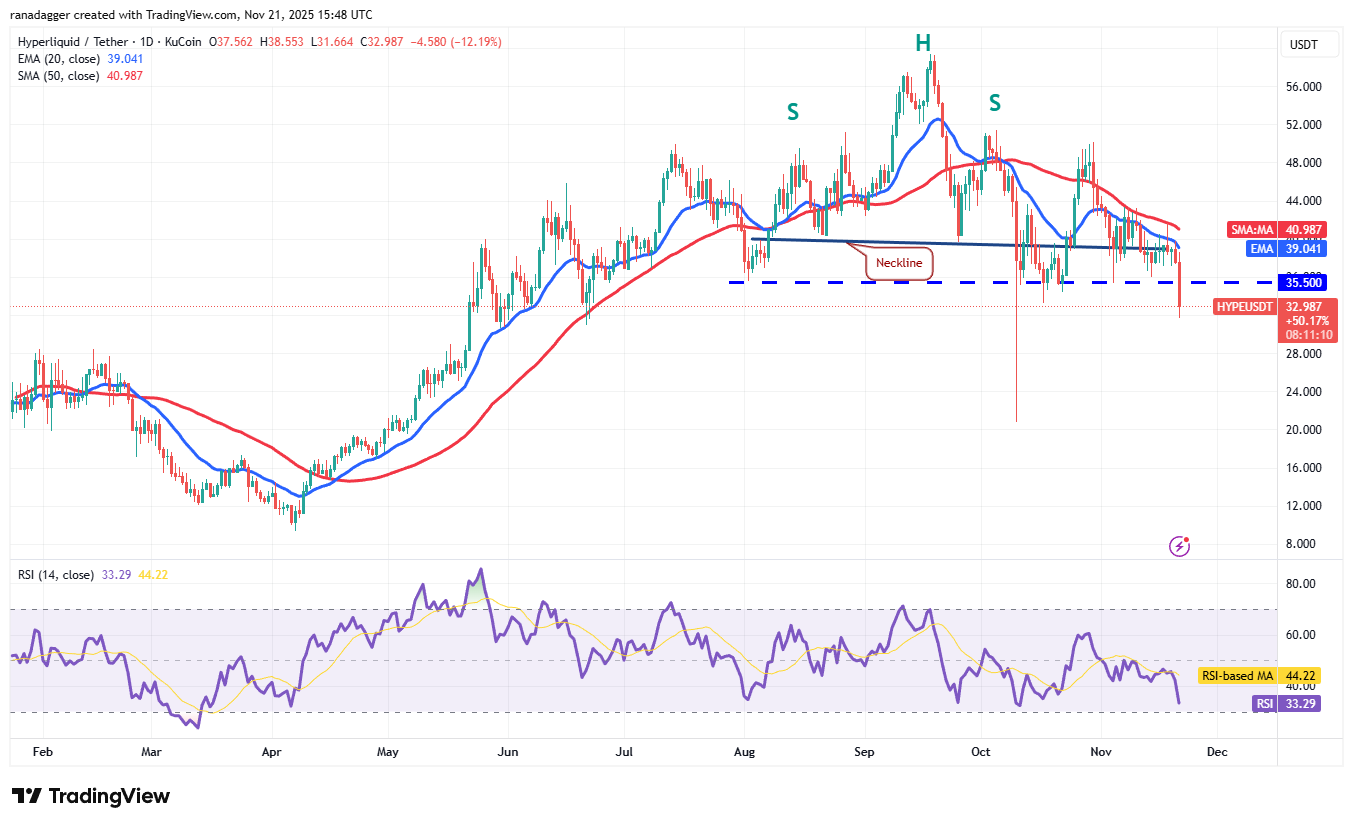 The selling picked up, and the bears pulled the price below the $35.50 support on Friday. If the price closes below $35.50, the HYPE/USDT pair could start a new downtrend toward $28 and then $24.