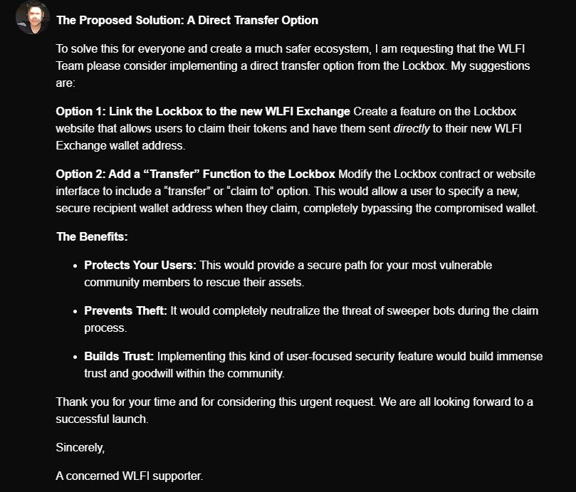 Anton is also requesting the WLFI Team to consider implementing a direct transfer option for the tokens.