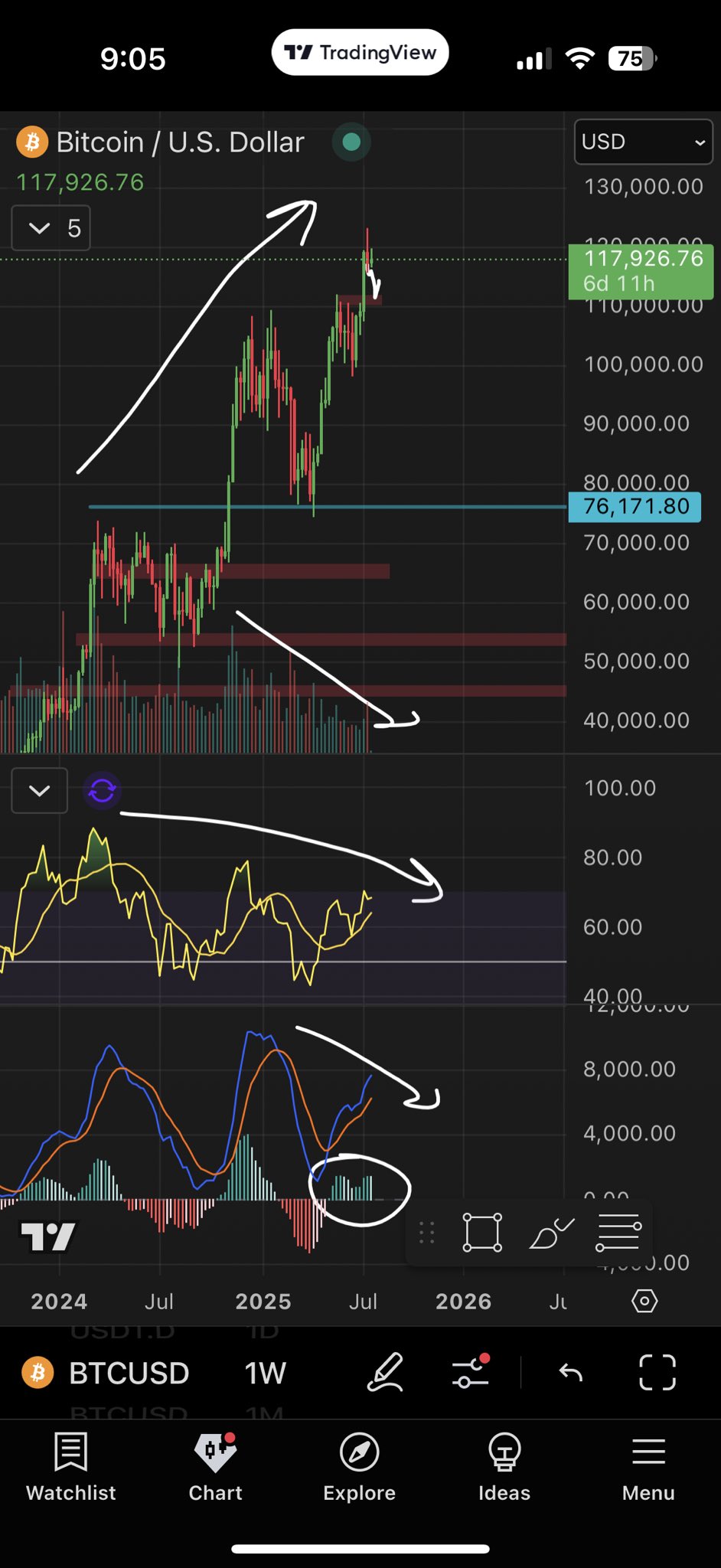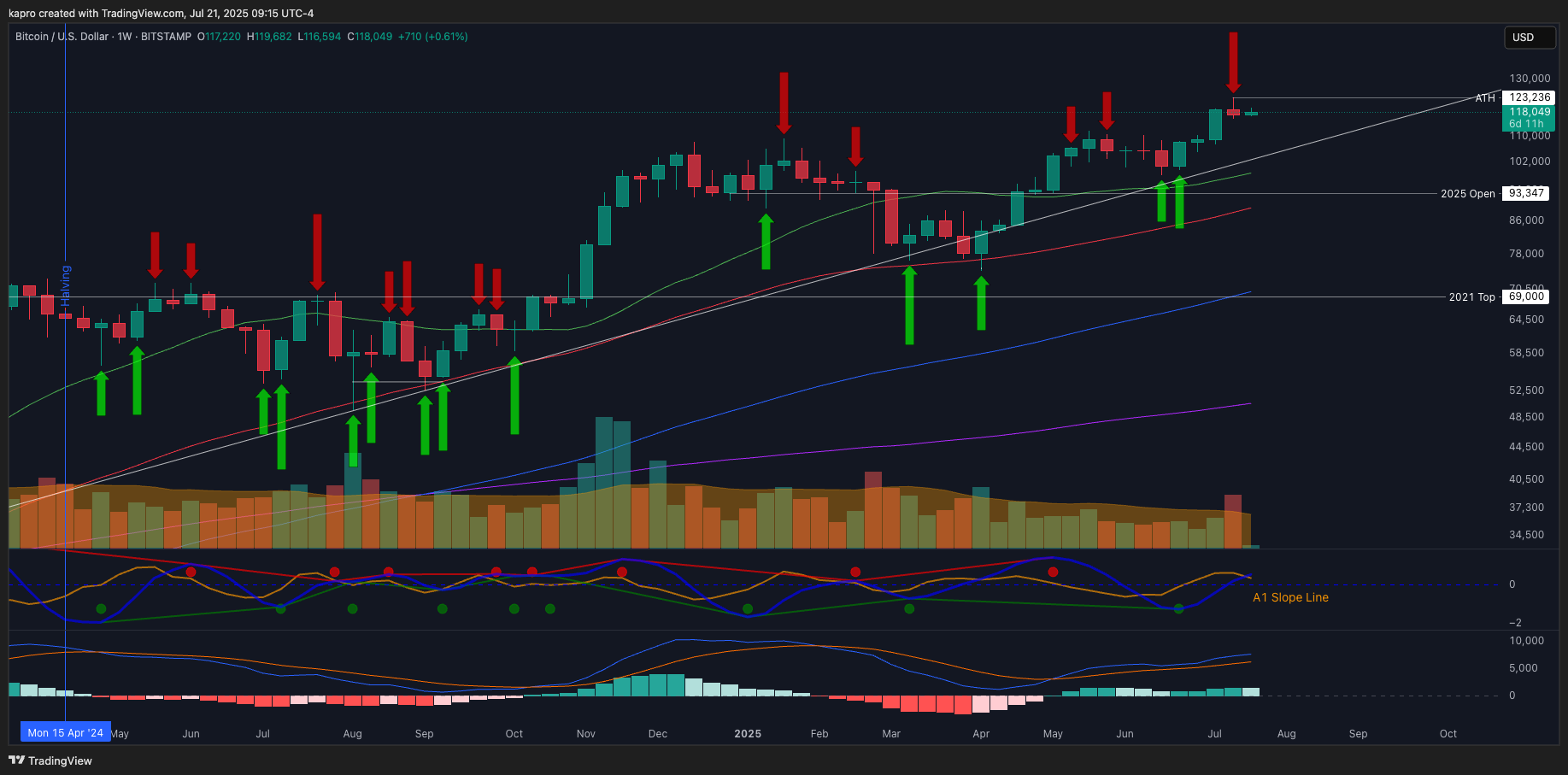Analyzing the weekly chart, Roman warned of “exhaustion” creeping in across price indicators, notably the relative strength index (RSI) and moving average convergence/divergence (MACD).