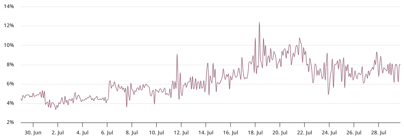 Even measured in XRP units, the current 2.82 billion contracts represent a 12% decrease from the peak. One could argue that much of the excessive bullish leverage has already been flushed out, given that liquidations totaled $325 million during the two weeks ending July 25. Still, open interest remains 48% higher than one month ago in XRP terms, leaving valid reasons for caution.