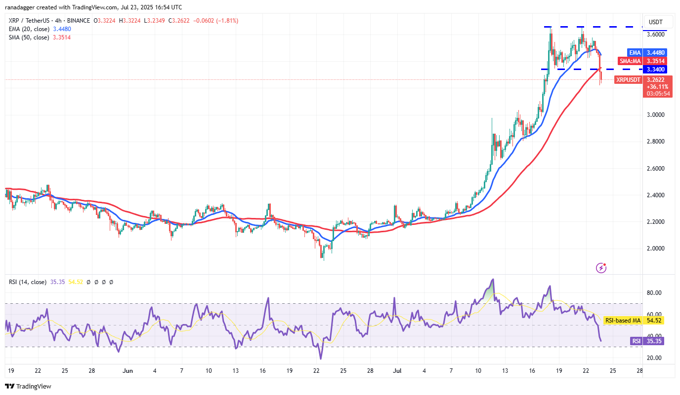The XRP/USDT pair could plunge to the 20-day exponential moving average ($2.99), which is a critical level to watch out for. If the price turns up from the 20-day EMA with force, it signals buying at lower levels. The bulls will then try to push the price to $3.66. A break and close above $3.66 could thrust the pair to $4 and then to $4.86.