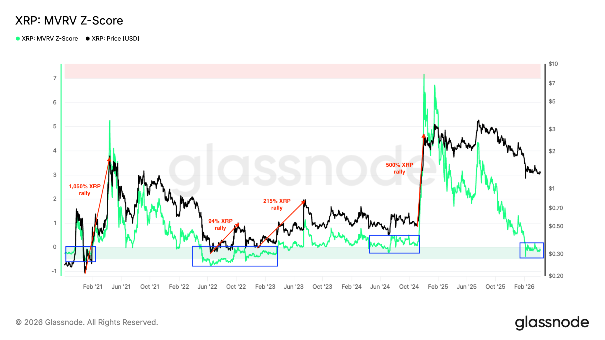 Note that the last time XRP’s MVRV Z-score fell to similar levels in late 2024 coincided with a macro market bottom at $0.30 and preceded a multi-month rally, with the XRP/USD pair rising 500% to a multi-year high above $3.