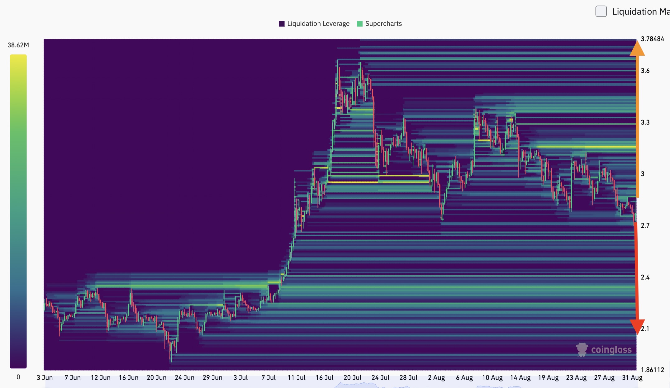 The liquidation heatmap shows XRP buyers stepping in at $2.70. Large clusters of ask orders are also sitting between $2.87 and $3.74.