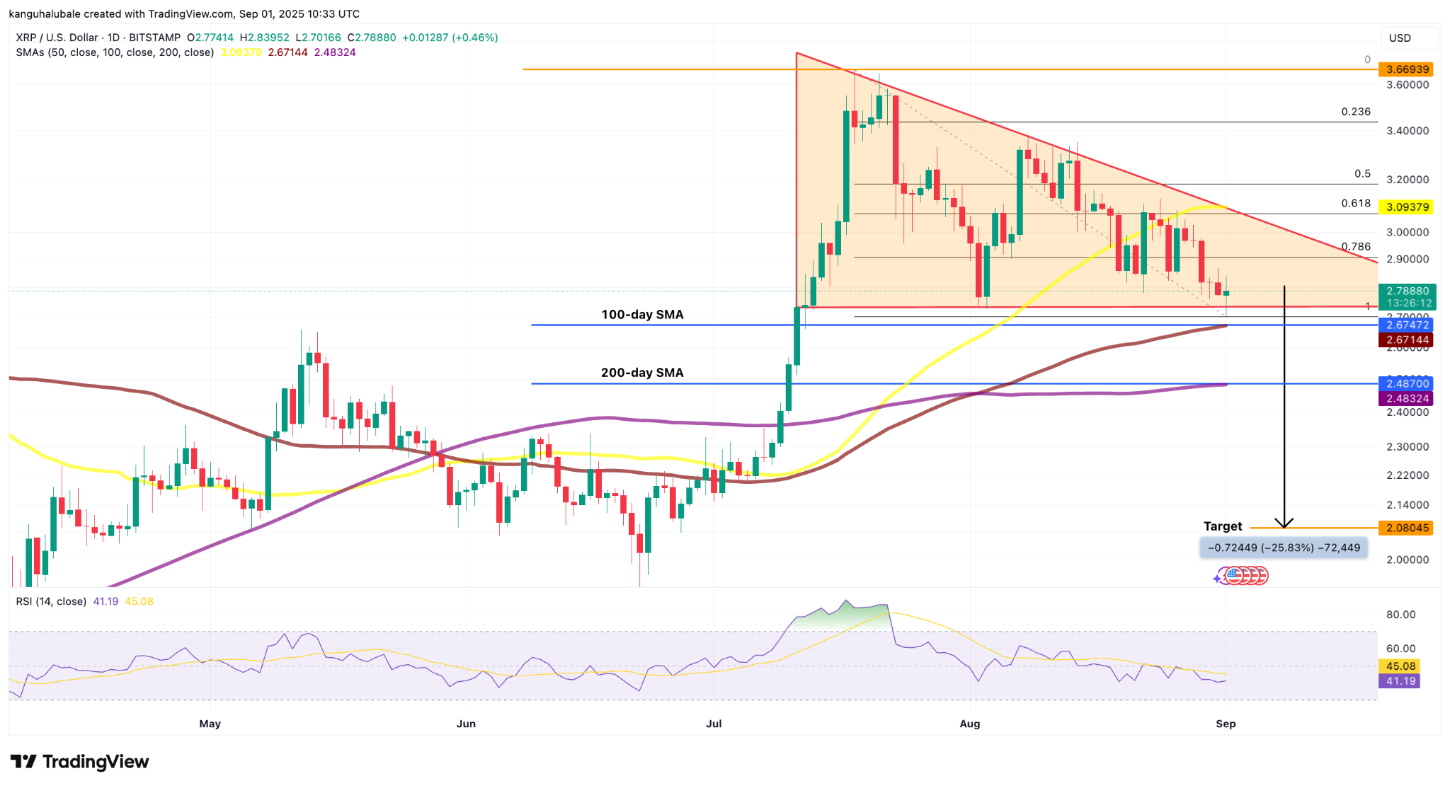 A breakdown of this level will see XRP price fall toward the downside target at around $2.08 over the next few weeks, down 25% from current price levels.