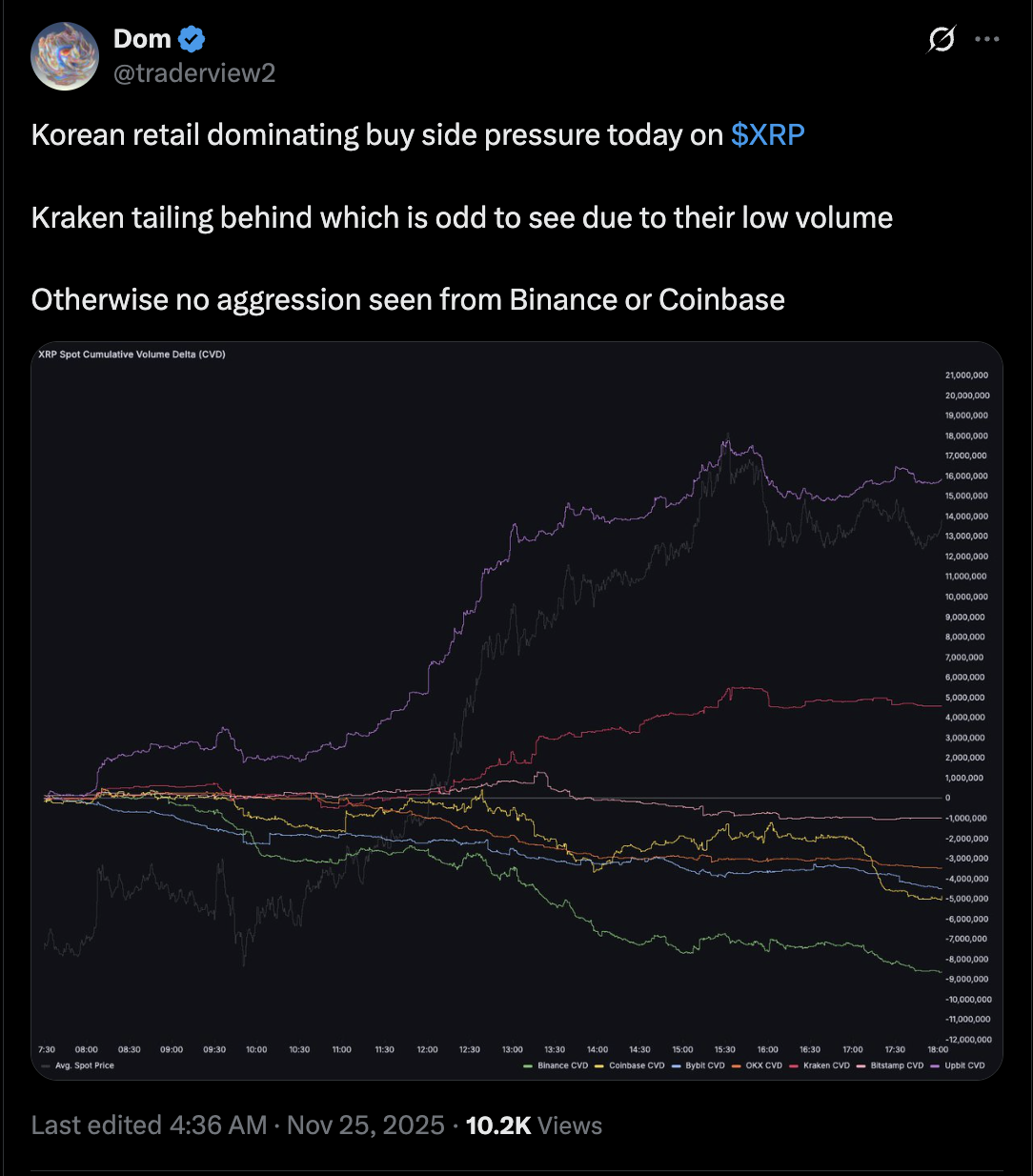 However, these EMAs sit almost exactly at the upper trendline of XRP’s descending channel, in a pattern that has guided the price lower since the summer.