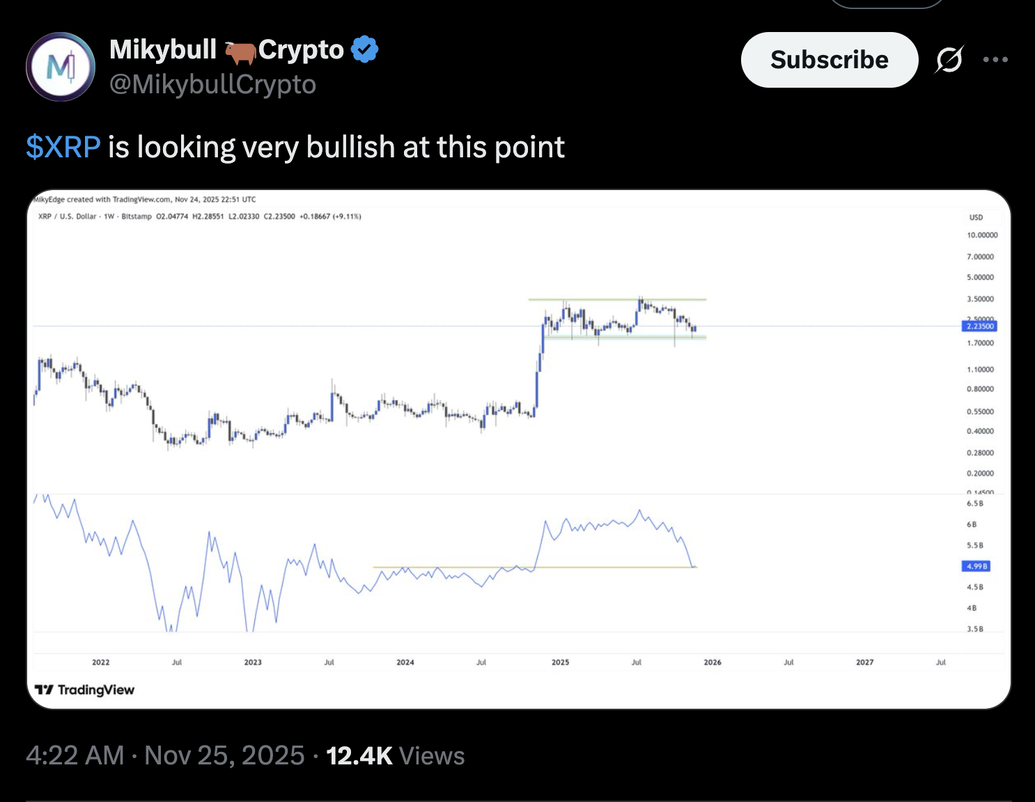 For XRP, OBV bounced from a major support area right as the price touched $2. That’s important because it shows real spot buyers stepped in, instead of exiting, said Mikybull.