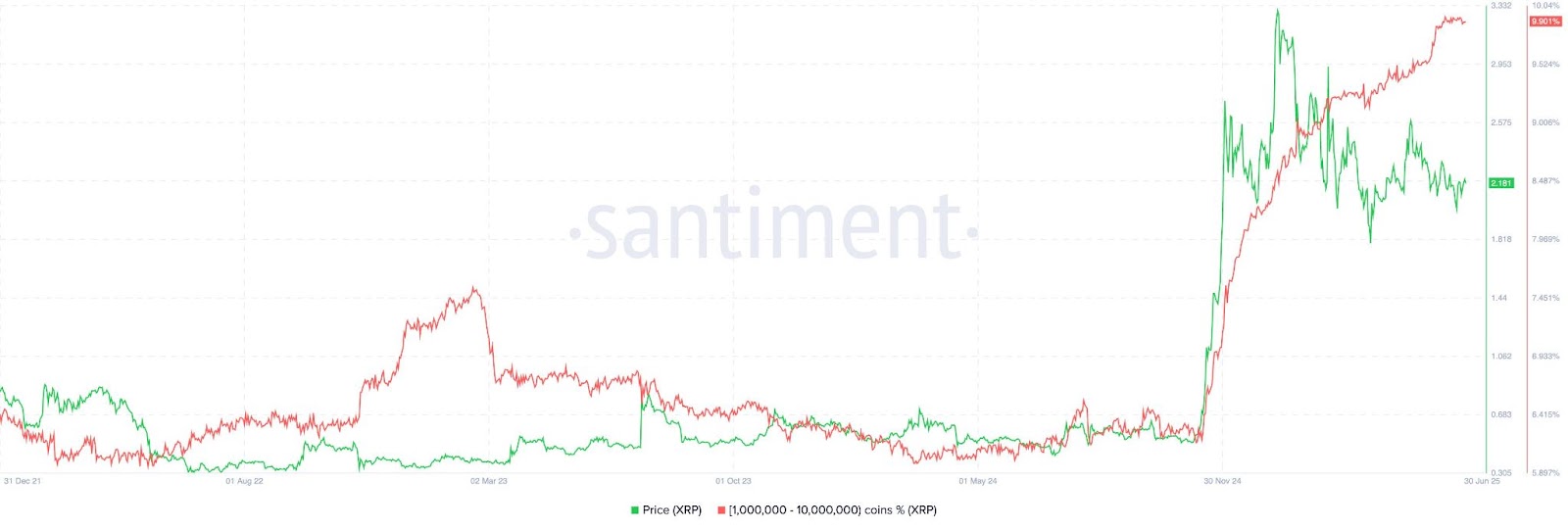 Percentage of addresses holding between 1M and 10M XRP. Source: Santiment
