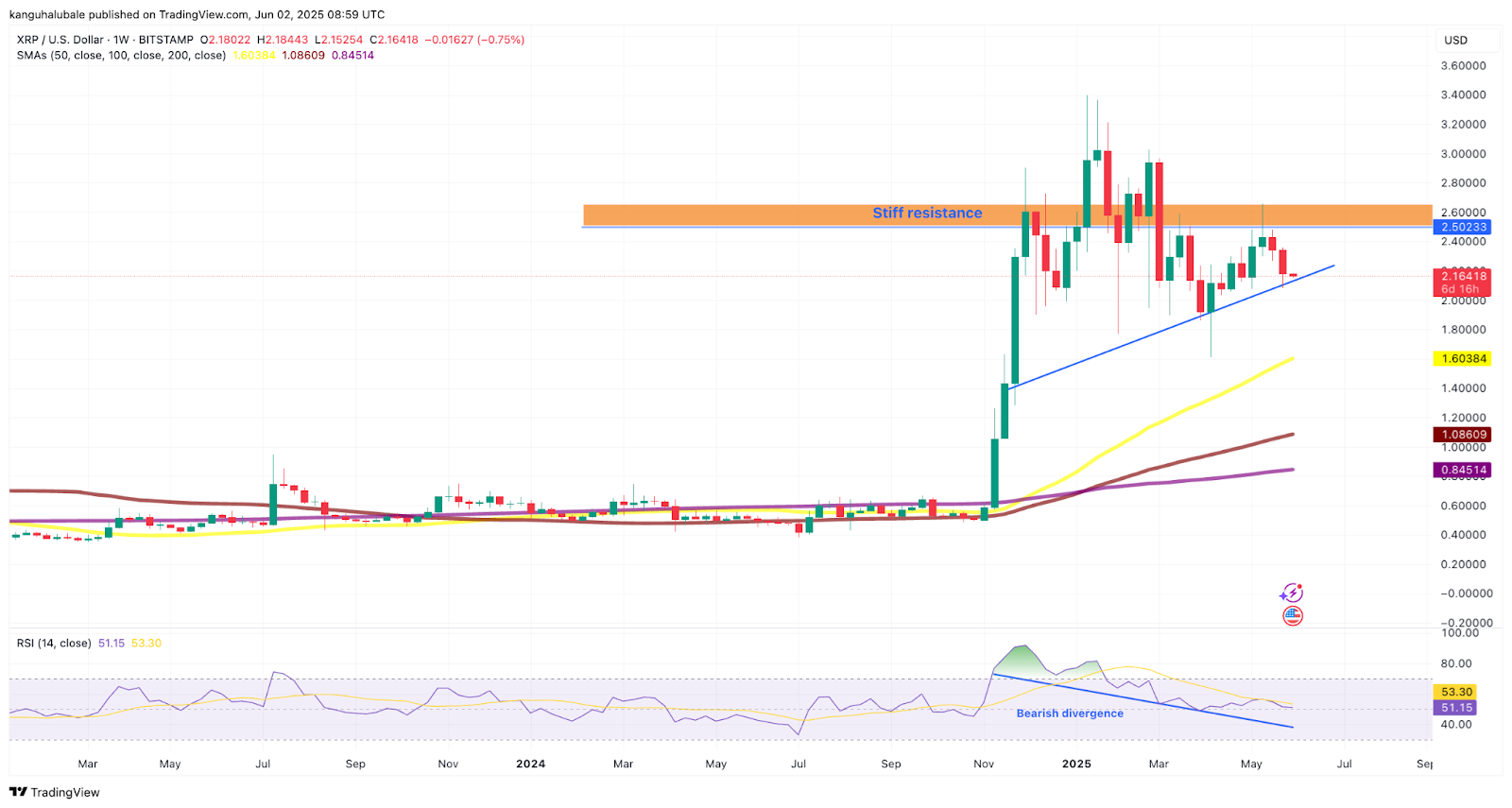 XRP’s downside is supported by a growing bearish divergence between its price and the relative strength index (RSI).