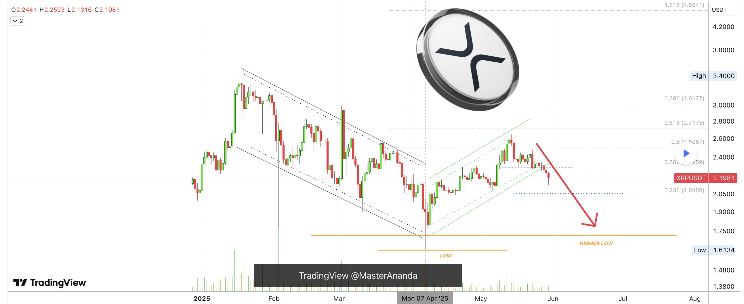 XRP price traded 18% below its May peak of $2.65, and a convergence of several data points signals a possible drop toward $1.70.