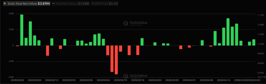 US-based spot XRP exchange-traded funds (ETFs) posted $3.89 million in net inflows on Thursday. This marked nine consecutive days of net inflows, totaling $73.78 million. This streak has pushed cumulative inflows to nearly $1.28 billion and AUM to $1.1 billion.