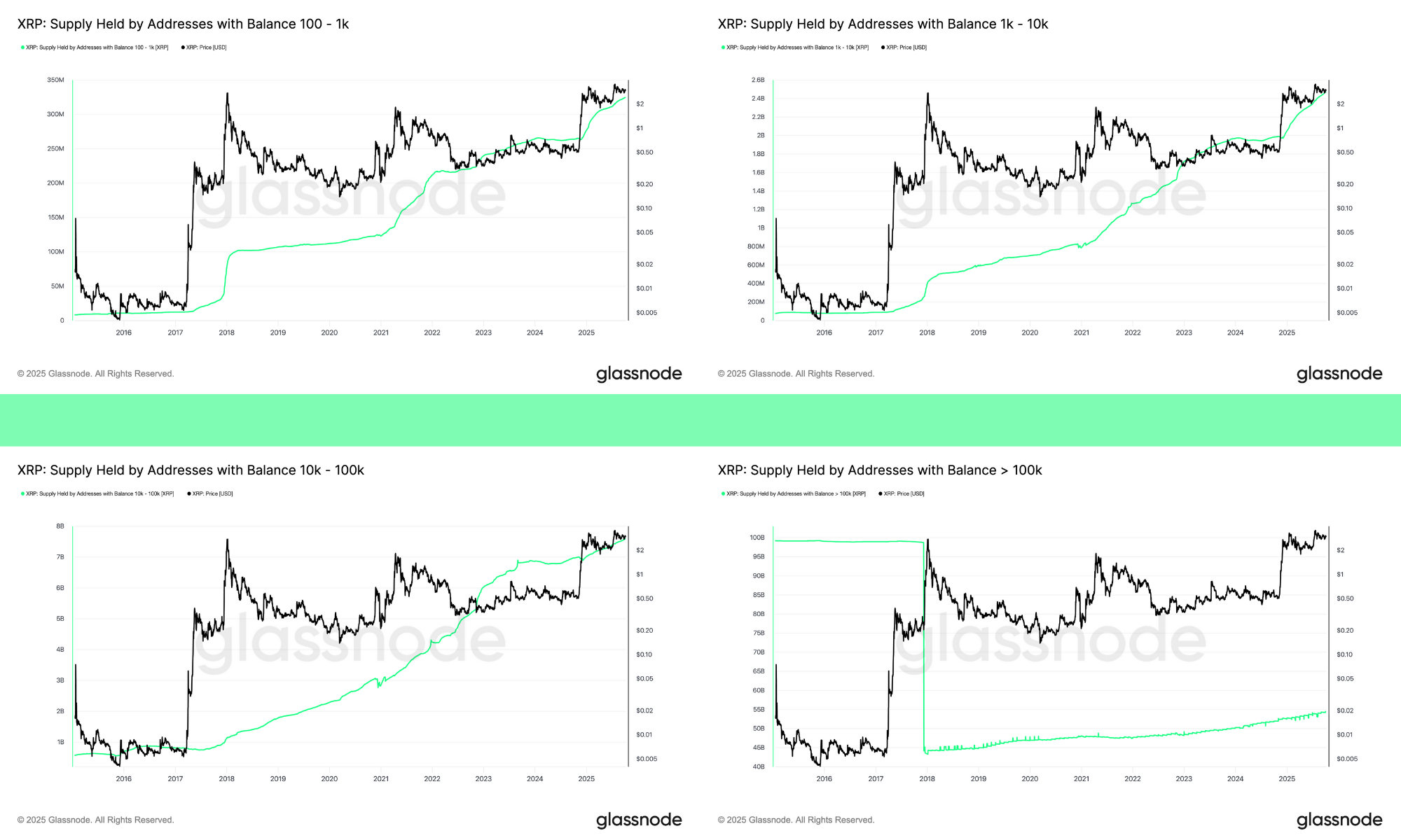 XRP supply held by addresses with 10-to-100K-plus token balance. Source: Glassnode