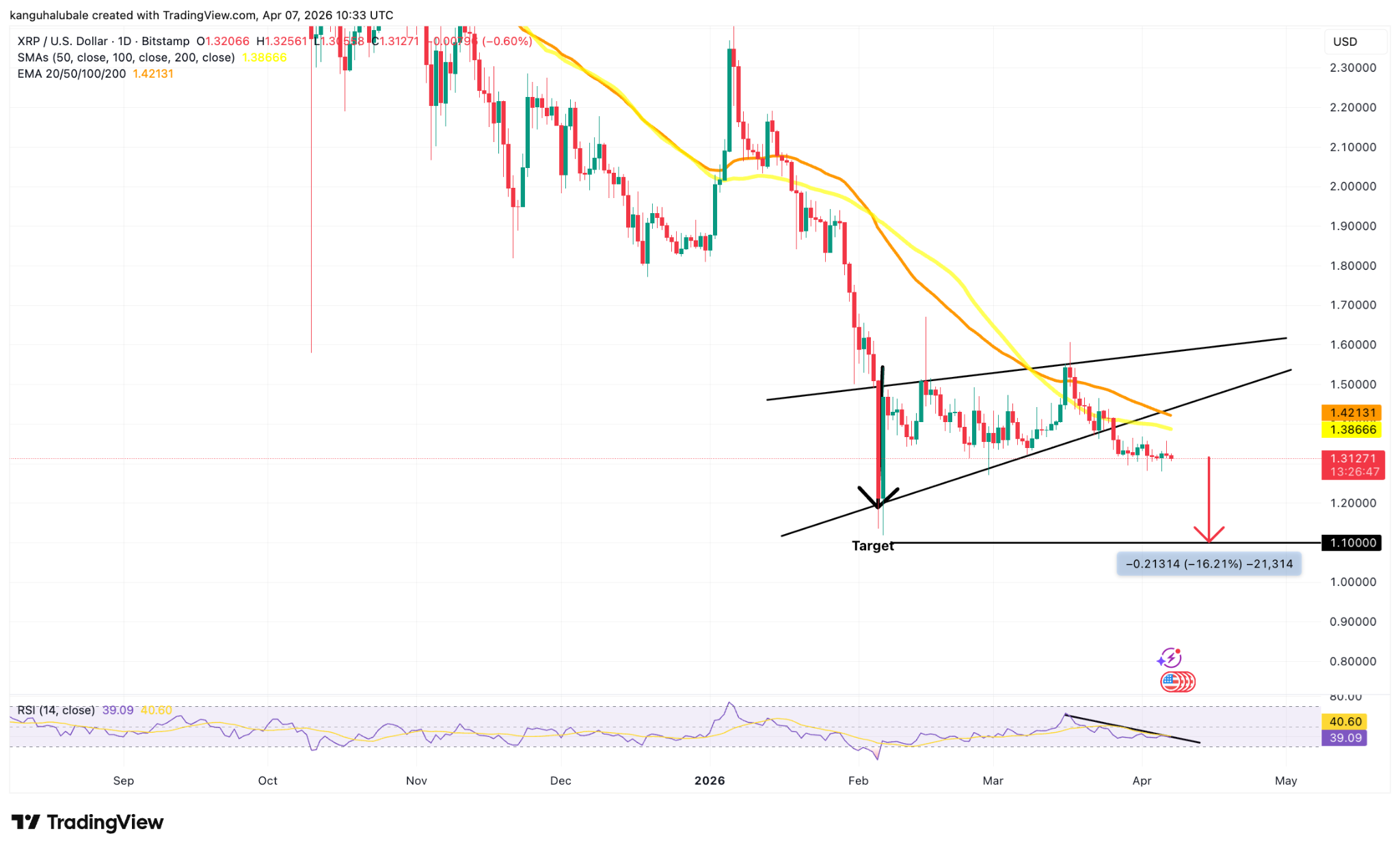 If XRP fails to reclaim the trendline and moving averages, the setup points to a deeper move toward the pattern’s measured target near $1.10, roughly 16% below the current levels.