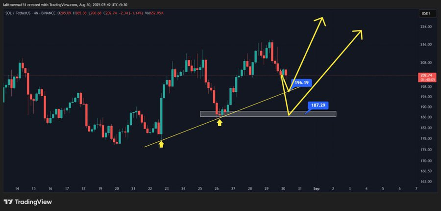 SOL is priced at about $202.9, declining by over 0.31% in the last seven days. Its market capitalisation stands at $109.7 billion, and trading volume has fallen 18.9% to $10.53 billion.