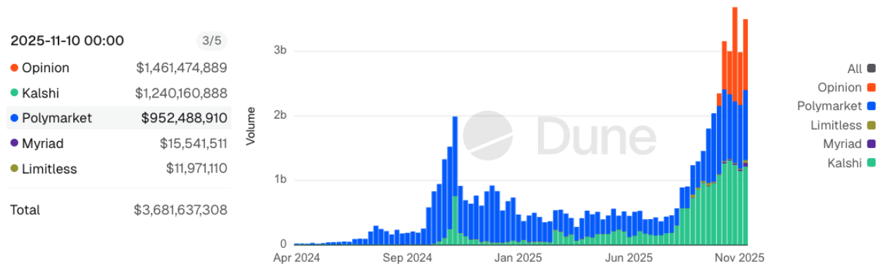 Just four weeks after launch, Opinion’s weekly volume jumped to nearly $1.5 billion, compared with $1.2 billion on Kalshi and roughly $1 billion on Polymarket, according to data compiled by Dunedata on Dune Analytics.